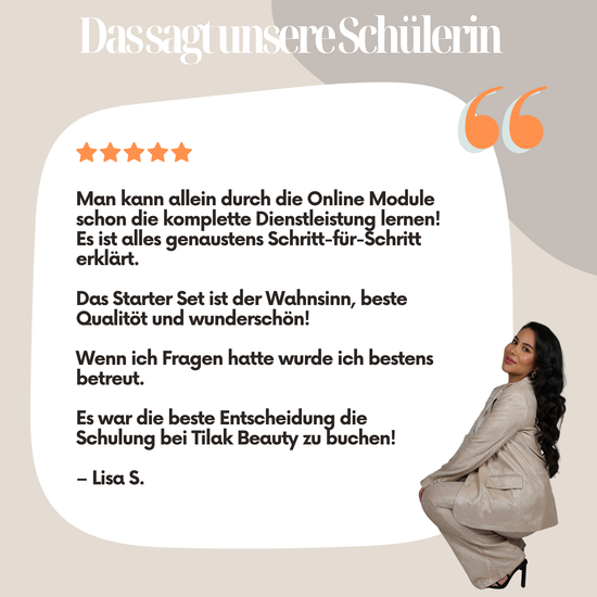 Ich bin Stephanie Weber, Gründerin von Tilak Beauty. Ich weiß genau, wie es ist, in der Beauty-Branche starten zu wollen und nicht zu wissen, wo man anfangen soll. Genau da stand ich selbst vor ein paar Jahren — voller Fragen, aber mit dem Wunsch, etwas Eigenes aufzubauen.Heute unterstütze ich Frauen dabei, sich ihr eigenes erfolgreiches Business mit Wimpernverlängerungen, Lash- & Brow-Lifting oder Permanent Make-up aufzubauen. Dabei stehen für mich ehrliche Beratung, klare Schulungen, hochwertige Produkte und persönliche Begleitung im Fokus.Egal ob du gerade startest, dich weiterentwickeln oder dein Studio mit den richtigen Produkten ausstatten möchtest — bei Tilak Beauty findest du alles, was du dafür brauchst. Ich freue mich, dich auf diesem Weg zu begleiten!