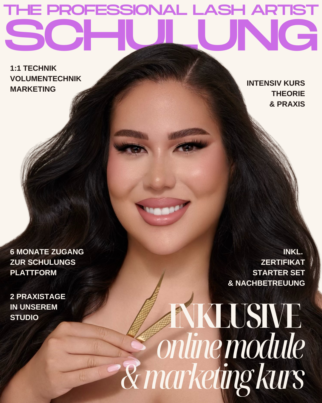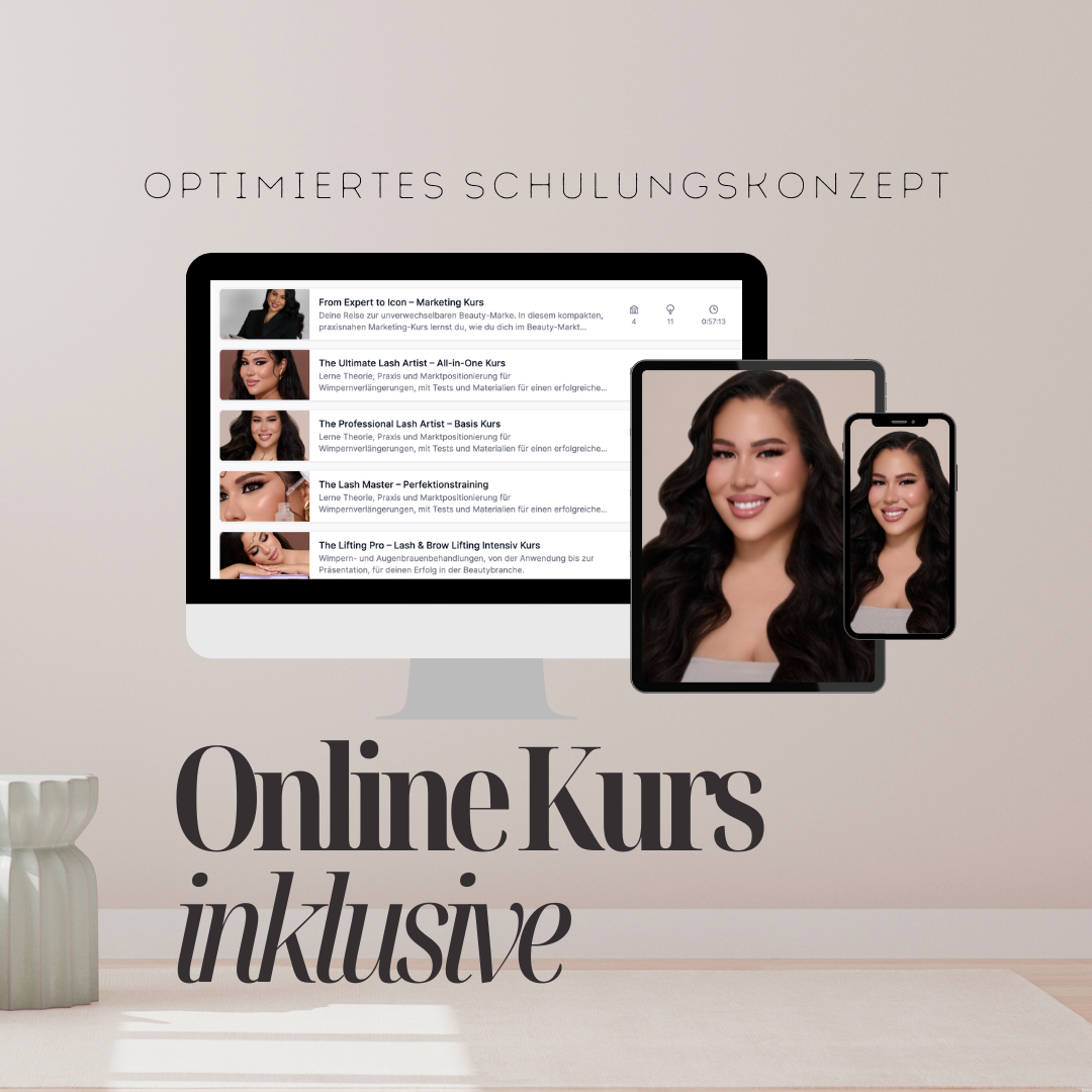 Als besonderes Extra bekommst du den Zugang zur kompletten Online-Plattform kostenlos dazu. Dort hast du 12 Monate lang Zugriff auf alle Inhalte, kannst jederzeit Techniken auffrischen und wirst persönlich per WhatsApp betreut. Nach erfolgreichem Abschluss erhältst du deine Zertifikate und profitierst von exklusiven Vorteilen wie Rabattaktionen, Social-Media-Reposts und Sonderkonditionen bei unseren Partnern.