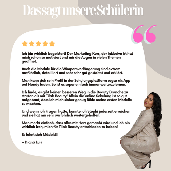 Ich bin Stephanie Weber, Gründerin von Tilak Beauty. Ich weiß genau, wie es ist, in der Beauty-Branche starten zu wollen und nicht zu wissen, wo man anfangen soll. Genau da stand ich selbst vor ein paar Jahren — voller Fragen, aber mit dem Wunsch, etwas Eigenes aufzubauen.Heute unterstütze ich Frauen dabei, sich ihr eigenes erfolgreiches Business mit Wimpernverlängerungen, Lash- & Brow-Lifting oder Permanent Make-up aufzubauen. Dabei stehen für mich ehrliche Beratung, klare Schulungen, hochwertige Produkte und persönliche Begleitung im Fokus.Egal ob du gerade startest, dich weiterentwickeln oder dein Studio mit den richtigen Produkten ausstatten möchtest — bei Tilak Beauty findest du alles, was du dafür brauchst. Ich freue mich, dich auf diesem Weg zu begleiten!